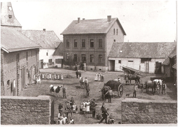 Mein Großvater Franz Courth verstarb im Jahre 1904 im Alter von 54 Jahren. Meine Großmutter Maria, geb. Hecking aus Mayen, sah sich mit 5 Kindern außer Stande den Frohnhof in Eigenregie weiterzuführen. Sie entschloss sich zur Verpachtung. Alle Beschäftigten des Frohnhofes mussten aus diesem Anlass Aufstellung auf dem Hof mit dem 1898 erbauten Haus für ein Erinnerungsfoto nehmen.