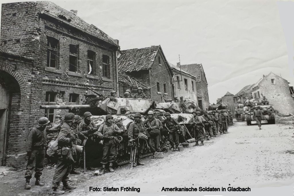 Auch Gladbach wurde von einer Bombardierung nicht verschont, wenn auch nicht in dem zerstörerischen Ausmaß wie Vettweiß. Weihnachten 1944 war die in der Dorfmitte befindliche Gaststätte samt Nebengebäuden einem Angriff ausgesetzt, dem Zivilisten und mehrere Soldaten zum Opfer fielen. Der Bombenteppich setzte sich bis zum Friedhof fort, wobei eine Anzahl von Gräbern verwüstet wurde. Auf Anordnung der Militärregierung vom 06. Juni 1945 mußten alle Friedhöfe, auch Judenfriedhöfe in kürzester Zeit in Ordnung gebracht werden. Einzusetzen waren vordergründig, so der Erlaß, stramme Nazi Parteimitglieder.